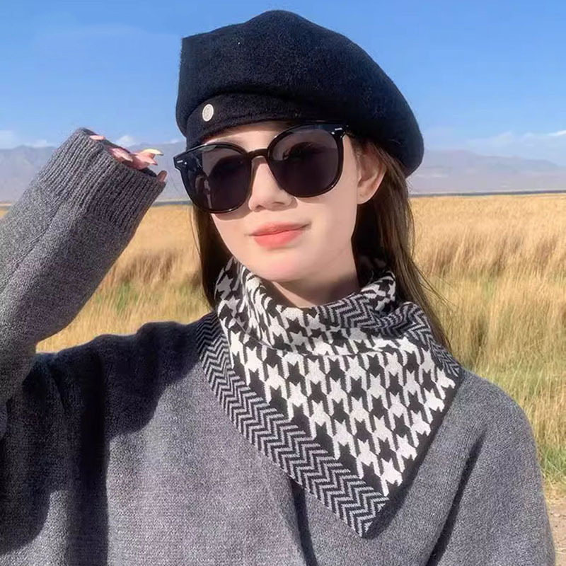 千鳥格のマフラーのニットは首を囲んで保温して首の外を保護します。