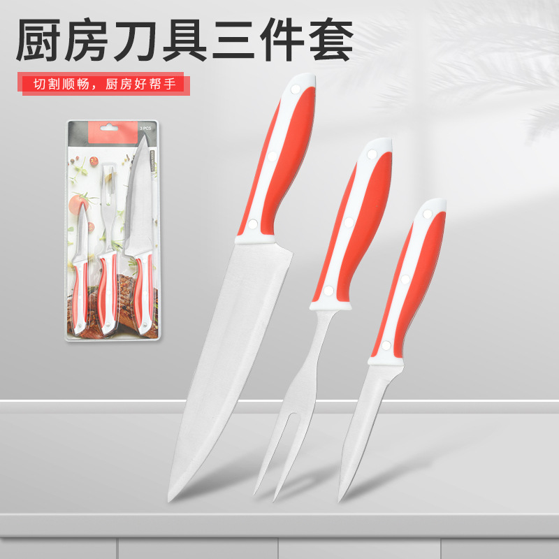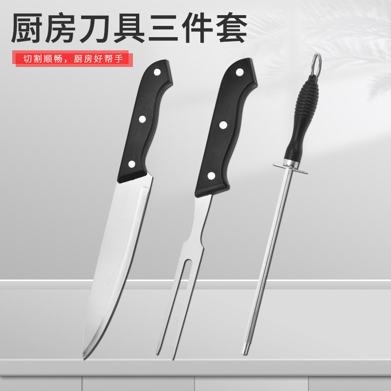 厨房刀具三件套不锈钢PP柄厨房刀肉叉磨刀棒锋利吸塑包装刀具套装
