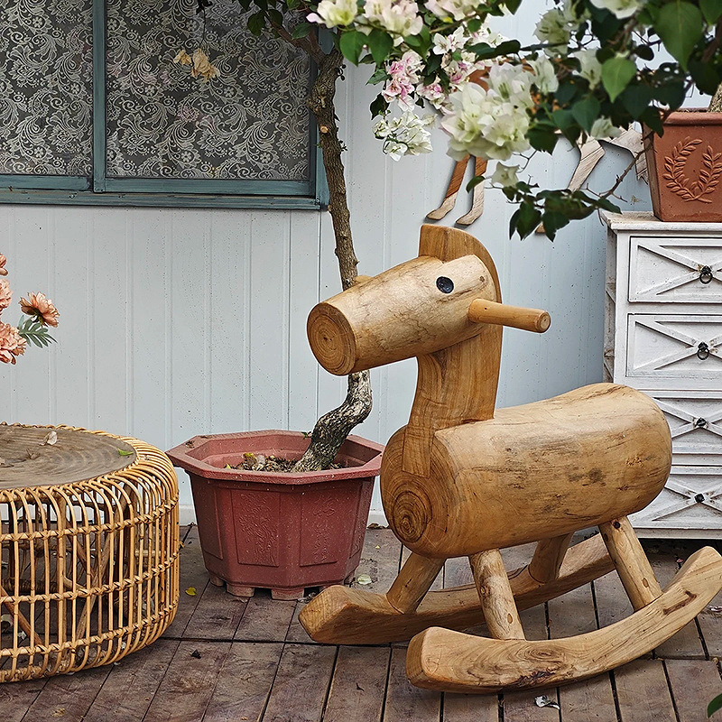 原木のロッキング馬は大人が木造の民宿の装飾品に座ることができます。