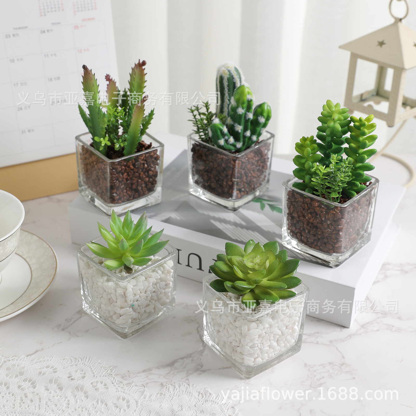 模擬多肉植物の小さな鉢植え、小さな正方形のガラス鉢、多肉植物のデスクトップ植物、オフィスのリビングルームの装飾、創造的な装飾品