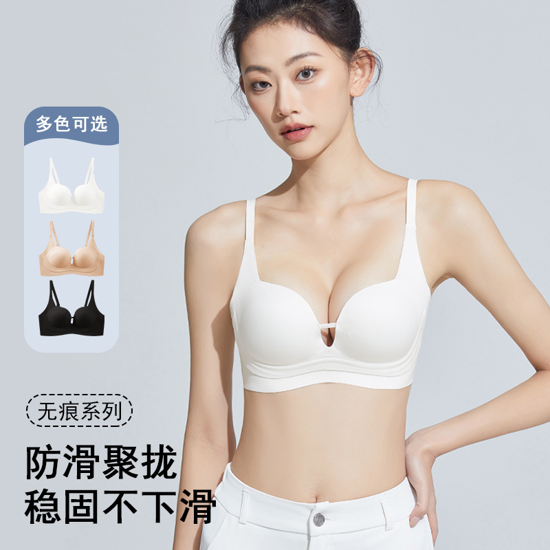 夏用シームレス反重力薄型通気性美背一体型固定カップブラ、脇寄せノンワイヤーブラ