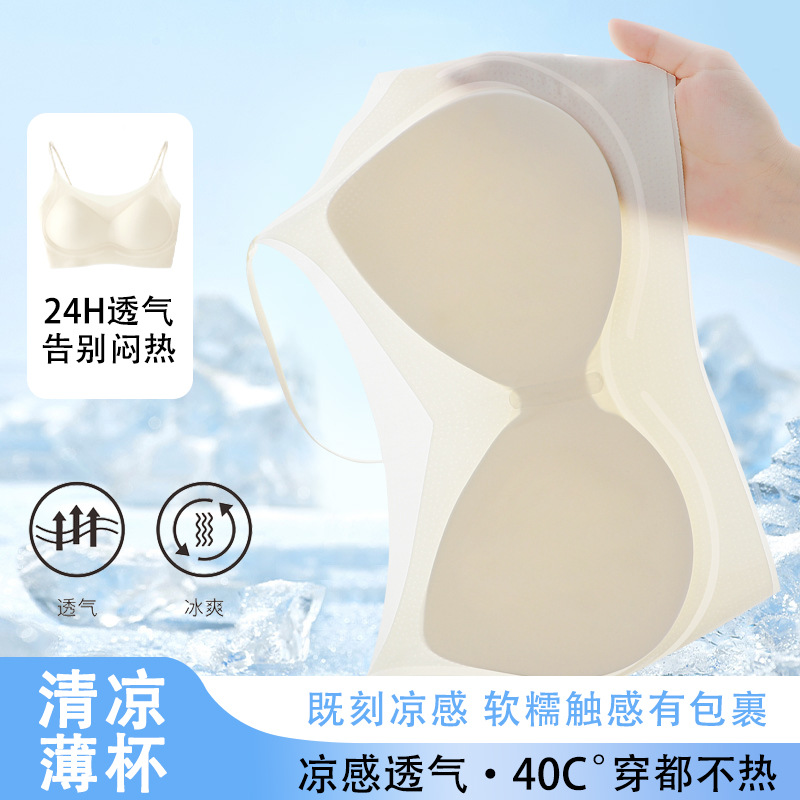 夏用薄型シームレスゼリーストリップスポーツブラ、細ストラップアイスシルク固定カップ、ノンワイヤー一体型キャミソールブラ