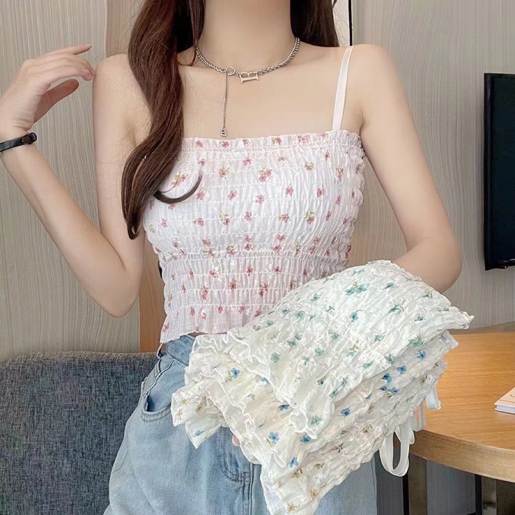 夏用薄手フレンチ風小花柄美背中キャミソール、胸パッド付き、デザインプリーツ、外でも着られるインナー、レディース