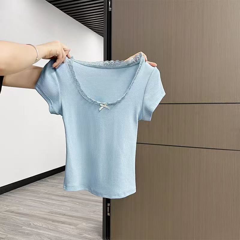 偽ツーピース純粋な欲望スタイルレースリボングレー半袖シャツホットガールスリム夏の女性の美しいショートトップ