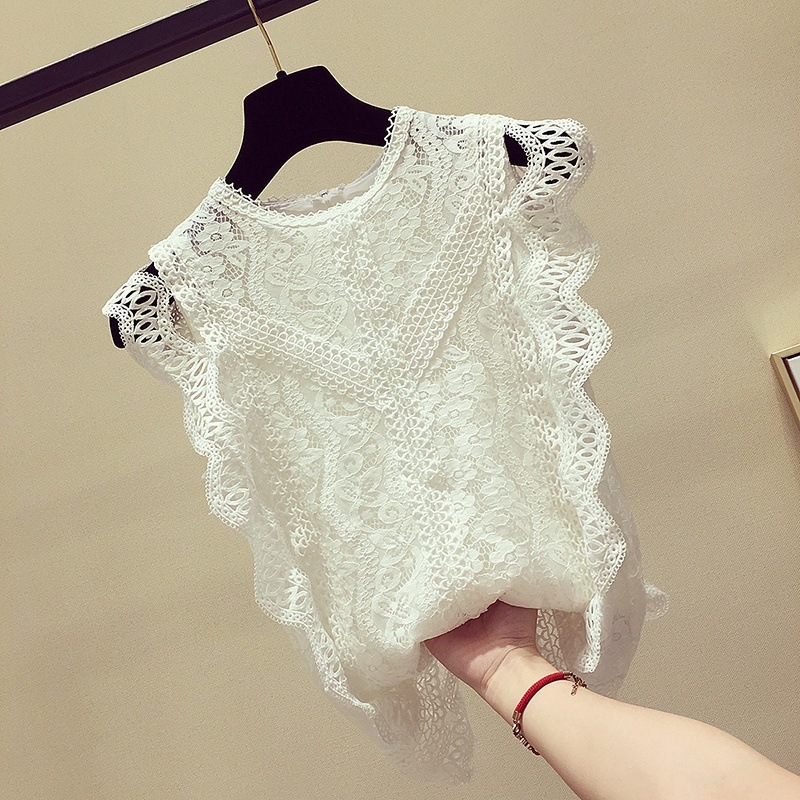 ヨーロッパセレブのエレガントな小さなスタンドアップカラー中空波状レースノースリーブショート多用途トップセクシーベスト