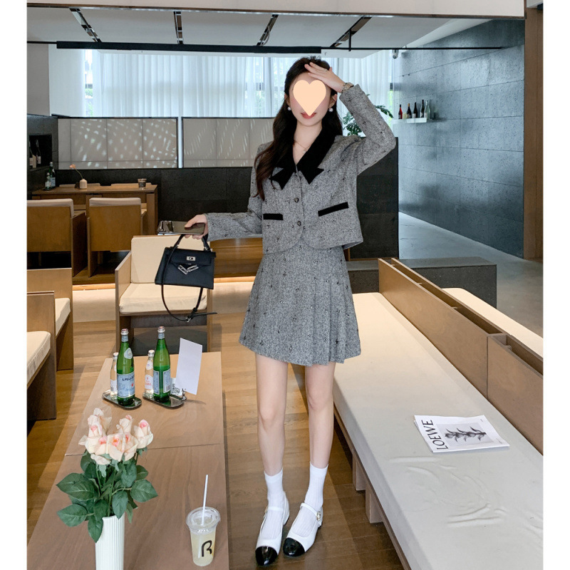女性のためのグレーの小さなフレグランススーツ 2025 春と秋の新しいスタイルの軽い豪華な気質ハイエンド長袖ジャケットとショートスカートの 2 点セット