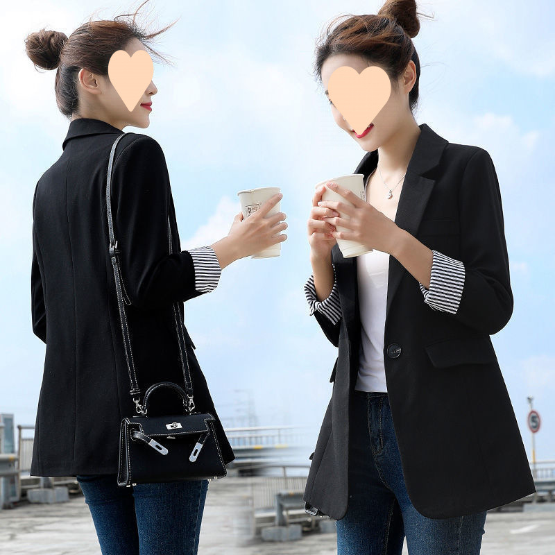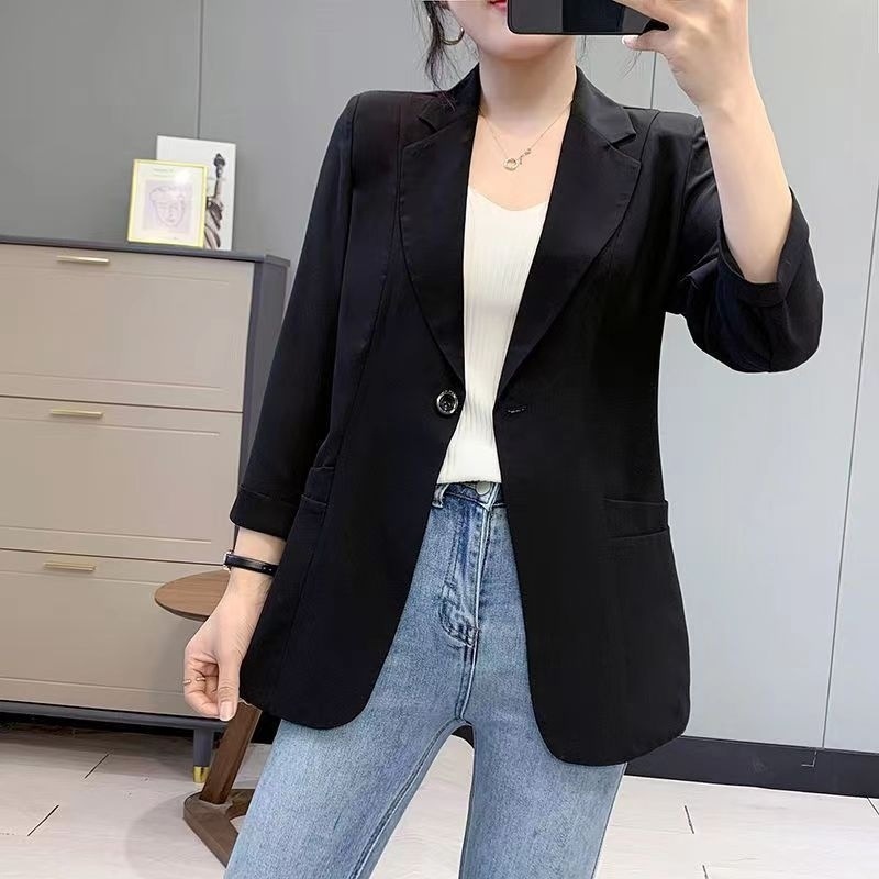 女性用の小さなブレザー、黒の七分袖、2025春夏の新しいカジュアルスリムスーツトップ、薄いスタイル