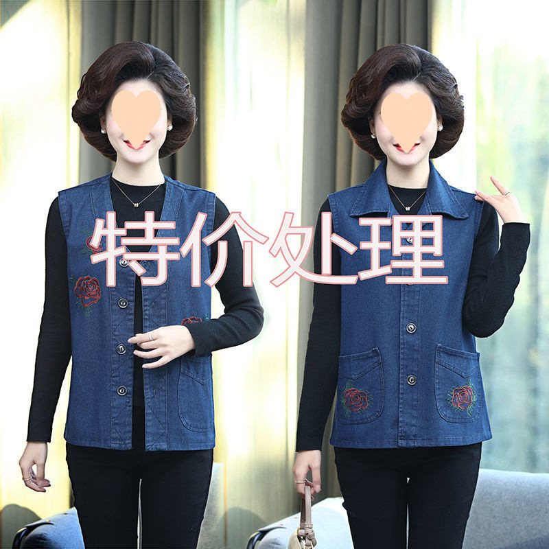 中高年女性用ベスト、デニム刺繍ベスト、春秋プラスサイズ、ゆったりノースリーブ薄手ベスト、マザーズジャケット