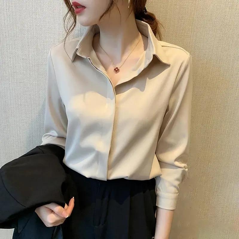 女性用模擬シルクシャツ 2025 新しいプロフェッショナルスーツ、長袖デザインニッチトップ白シャツ