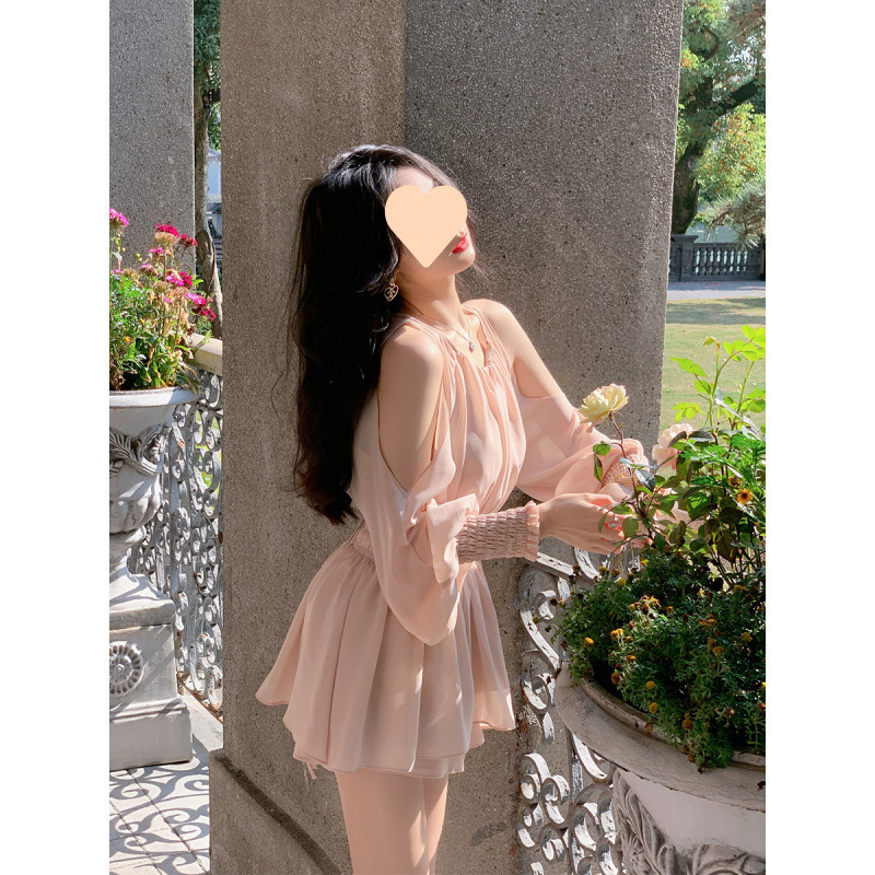 プラスサイズの女性の夏の優しいスタイルのオフショルダーパフスリーブシフォンドレス女性のフレンチウエスト痩身と年齢を軽減するショートスカート