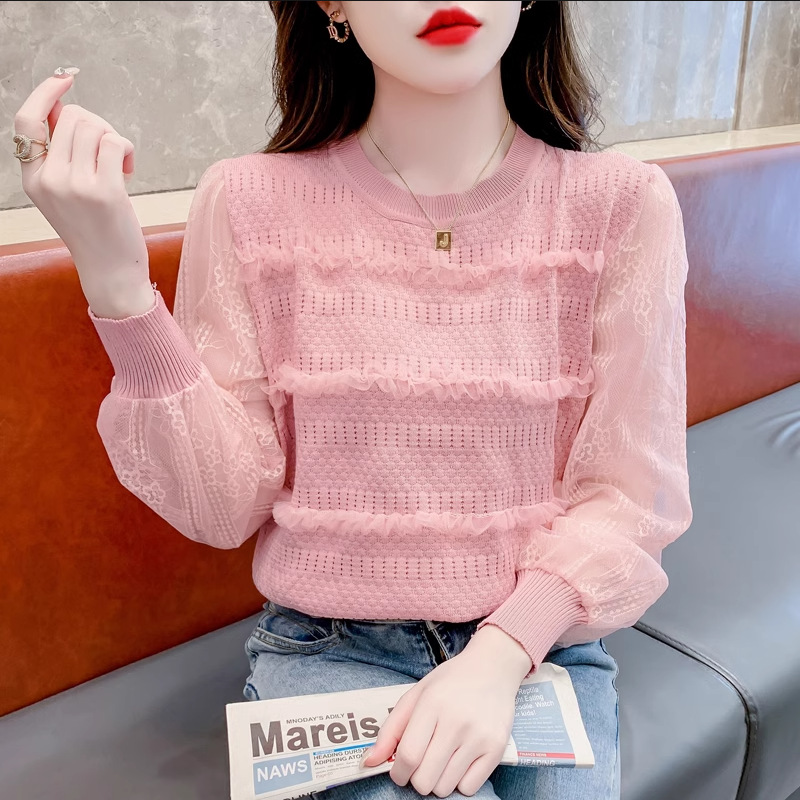 女性のためのキノコレーススプライシングセーター秋と冬の 2025 新しい気質シフォン長袖ラウンドネックボトリングシャツトップトレンディ