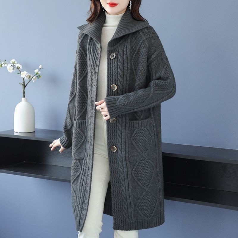 2025 ハイエンドビッグラペルセータージャケット女性の秋と冬のロングウールカーディガンルーズニット肥厚太い糸コート