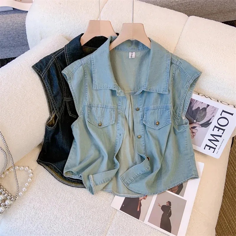 ノースリーブベストベストショートトップ女性の夏香港スタイル軽量アウターウェア薄いジャケットデニムベストジャケット