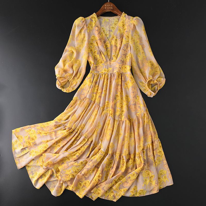 現物2025夏の新型フランス茶休襟黄色砕花ワンピース女性が痩せている灯籠袖のロングスカート