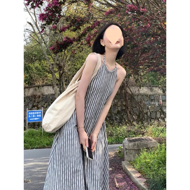 フレンチホルターネックドレスレディース2025夏新作ハイエンドストライプルーズスリムバックレスロングスカート