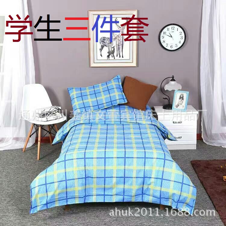 学生寮のベッドの上に純綿のプリントの格子のシーツが三点セットあります。