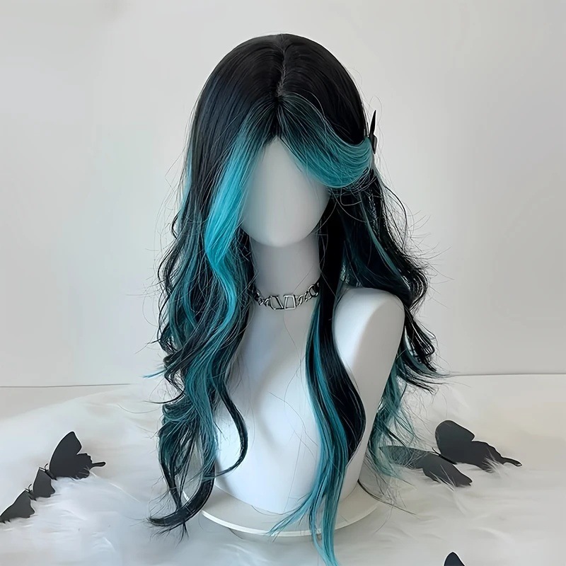 2025 クロスボーダーパーティクルレディースウィッグナチュラルシミュレーションレイクブルーパーティクルブラックバングシミュレーションオーバーヘッドウィッグ