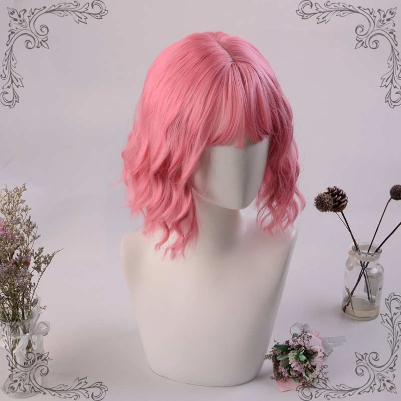 新しいかつらの全頭カバーLolitaピンクのかつらcosピンクのショートヘアはふわふわして顔を収めて頭皮をシミュレーションします。