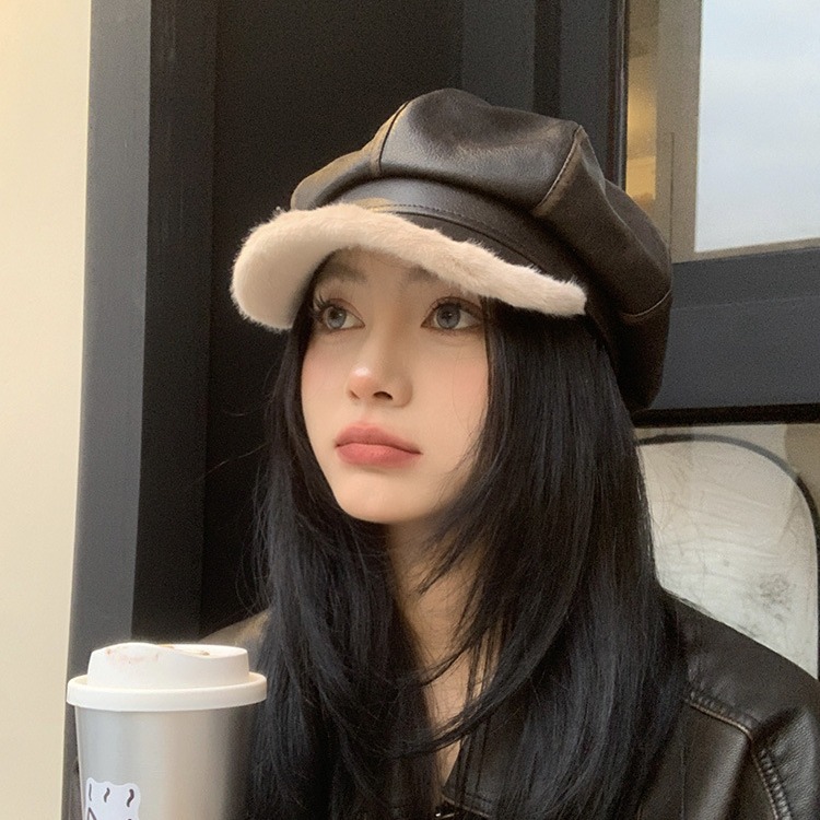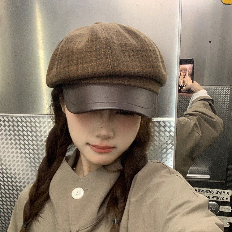 秋冬のレトロな茶色のpu皮は八角の帽子の女性をつなぎ合わせて顔を見せます。