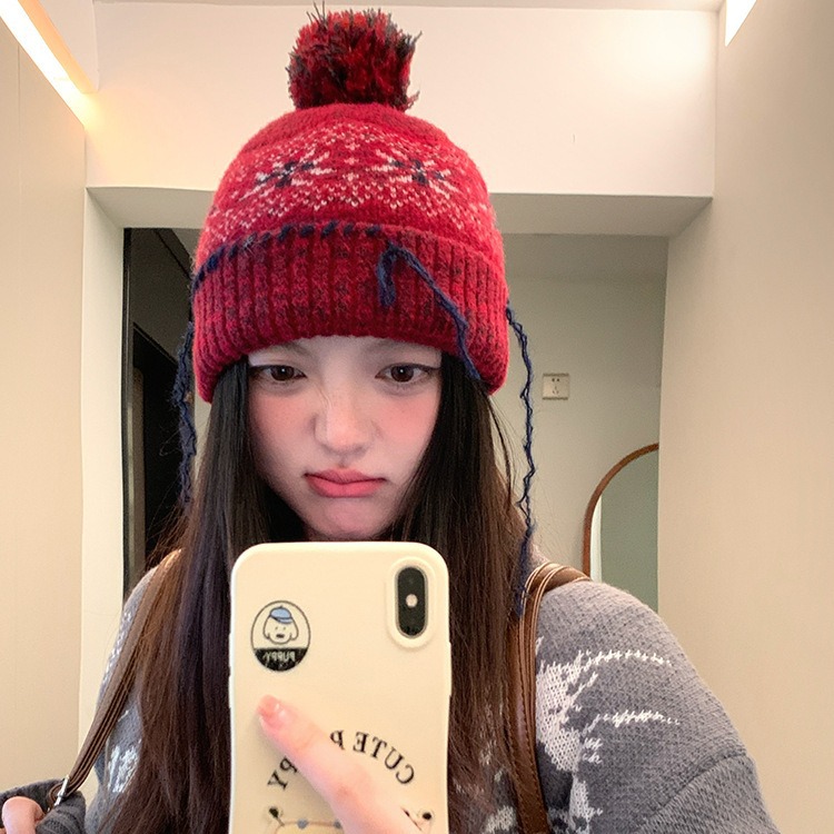 民族風復古衝突色毛糸帽子供の小衆保温雪模様ニット帽流蘇毛玉カバー頭冷帽