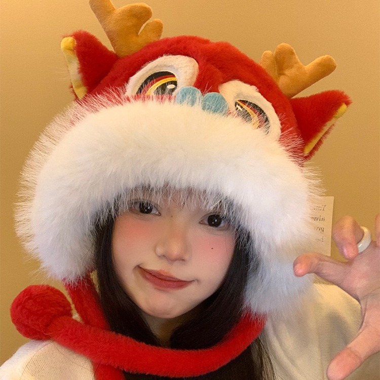 秋冬国潮獅子毛糸帽子子供中国風保温百合毛包頭帽子新年赤いニット