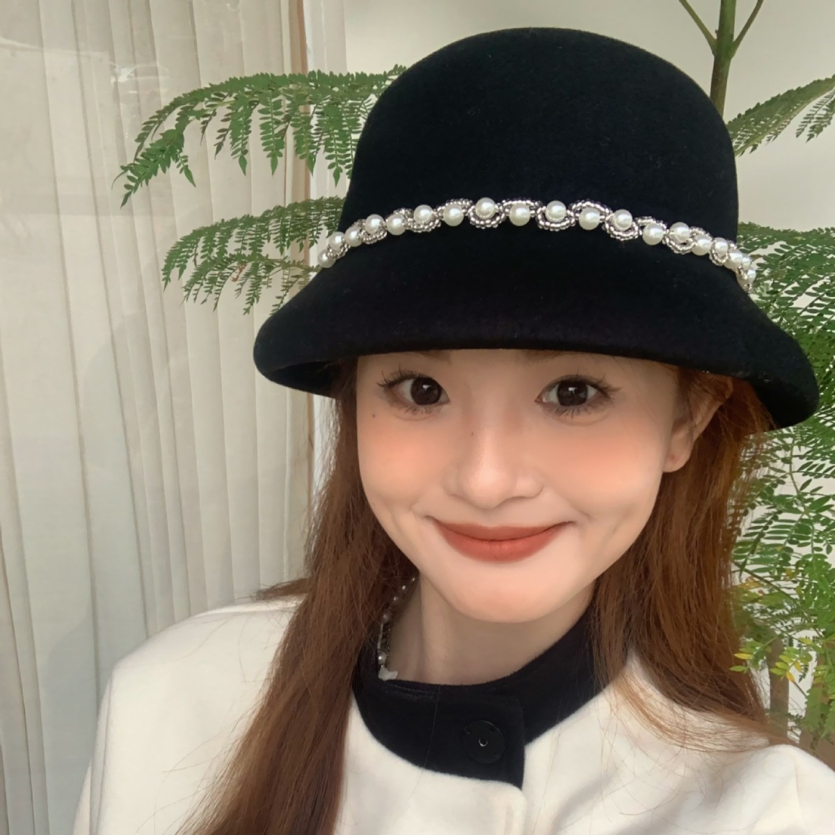 レトロで優雅なinsウールの帽子秋冬ヘボン風韓国版名媛真珠小香風気質バケツ帽
