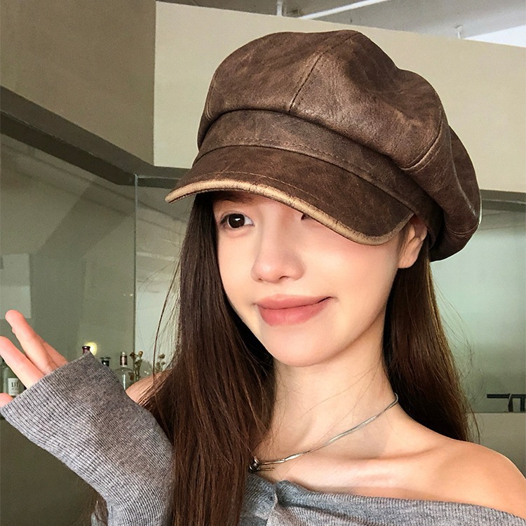 卸売り秋冬PU皮質八角帽子子供レトロな香港風文芸ベレー帽