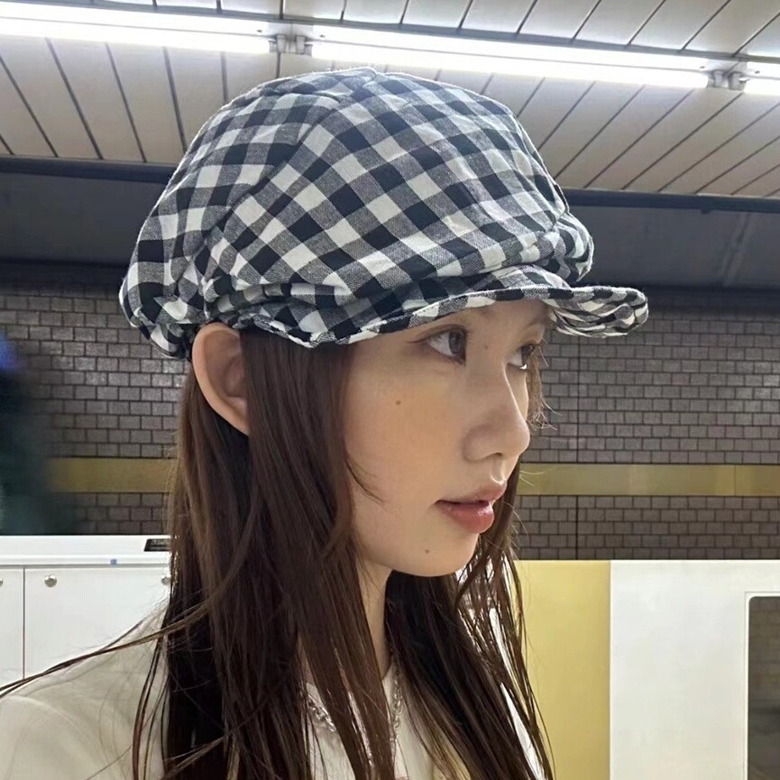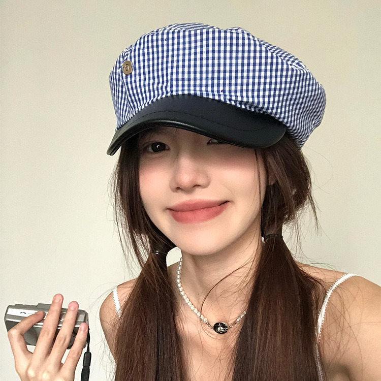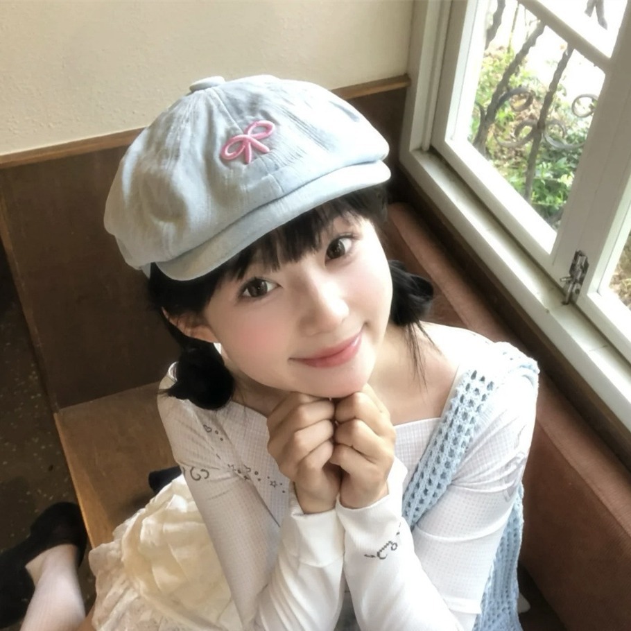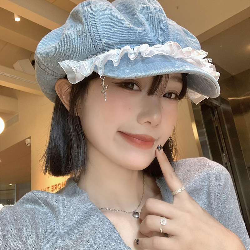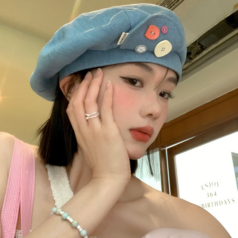 ベレー帽の女性は夏に甘くて可愛いです。デニムのボタンの画家の帽子は顔が小さいです。