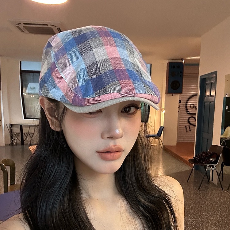 夏の薄い色の格子縞の前進帽子の女性の大きい頭の周りの文芸の画家の帽子の怠惰な復古のベレー帽の潮