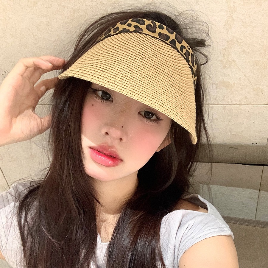 日焼け止め帽子豹紋ins日よけ空頂帽子子供旅行ランニング日焼け止め草編太陽帽子