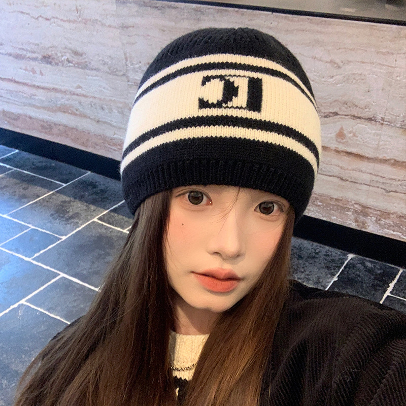 Ins韓国版百合毛糸帽子女性秋冬月子保温冷帽小衆個性アルファベット耳保護ニット