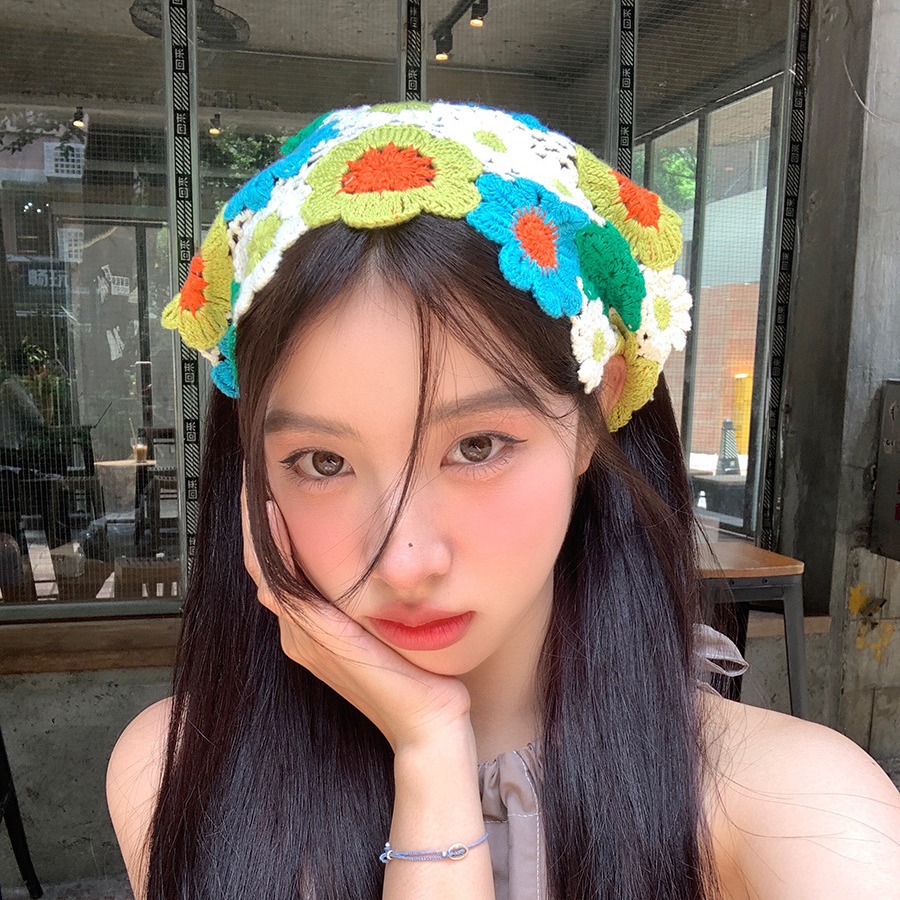馨は民族風の透かし彫りの三角タオルのカラーを手伝って、広い辺の髪を編んでかわいい甘いフックの花のスカーフの女性を編みます。