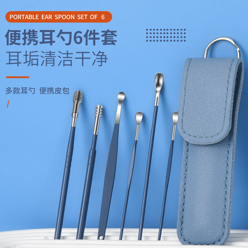 工場卸売りステンレスの耳かきスプーン6点セット携帯式スパイラルバッグ耳抜きスプーンセット