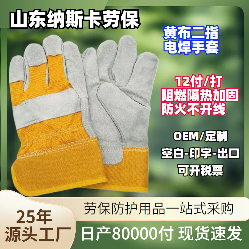 卸売溶接耐摩耗性作業用手袋、半革溶接工用手袋、黄色布製、2本指、フルパーム、電気溶接、アーク溶接用