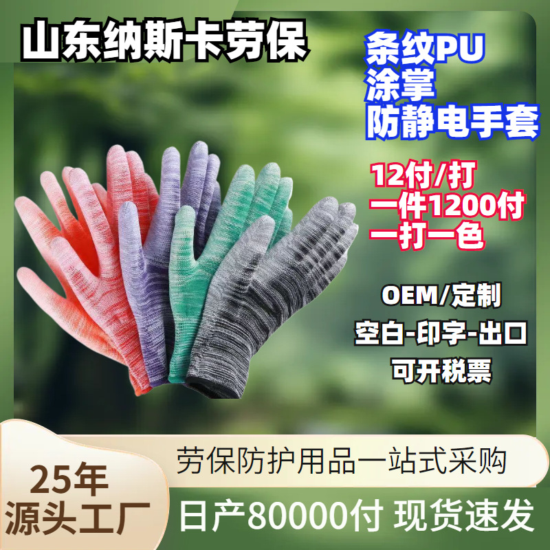 批发PU条纹涂掌手套防滑舒适尼龙乳胶透气耐磨防静电防护工厂手套