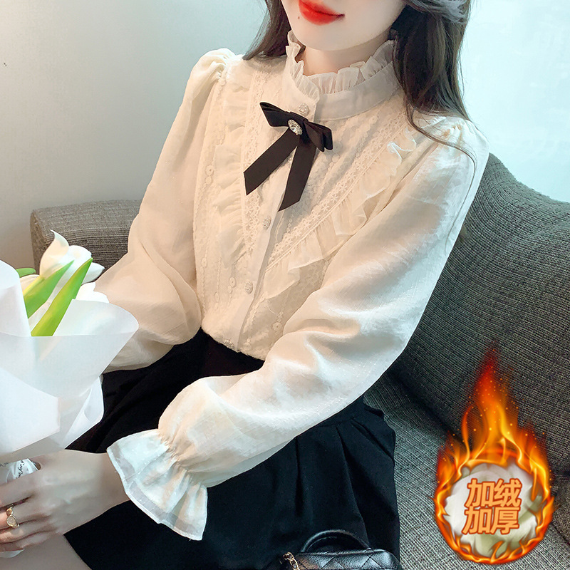 現物実拍2024秋冬新作韓国版百合カシミヤ長袖レース女性レースシャツ