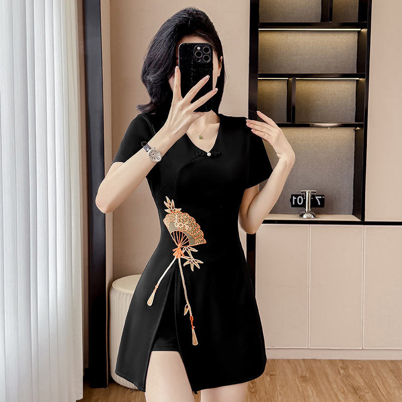 実物写真の夏の新しい婦人服中国風の新しい中国風改良されたチャイナドレススーツ気質ドレスショーツ2点セット