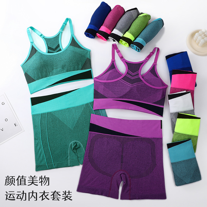 クロスボーダー衝突色運動ブラジャーセット工字背フィットネスヨガジョギング防震胸収腹提尻形ズボン