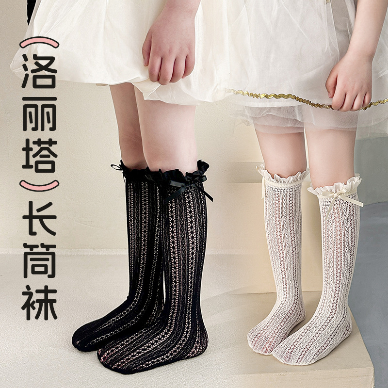 日本のレトロな薄いクリームの白い甘い風の縦の紋様の透かし彫りのジャカードの耳元の蝶結びのふくらはぎの靴下の子供