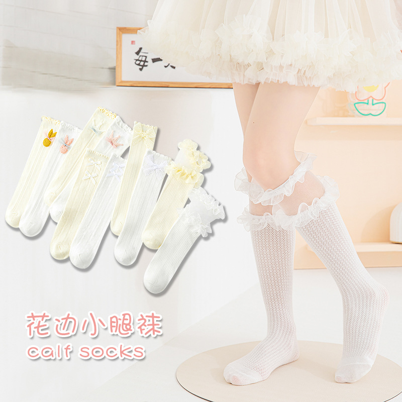 白い蝶結びのふくらはぎの靴下の子供の中筒の靴下のレースの夏の薄いタイプの綿のネットの目は透かし彫りにして夏に靴下を積みます。