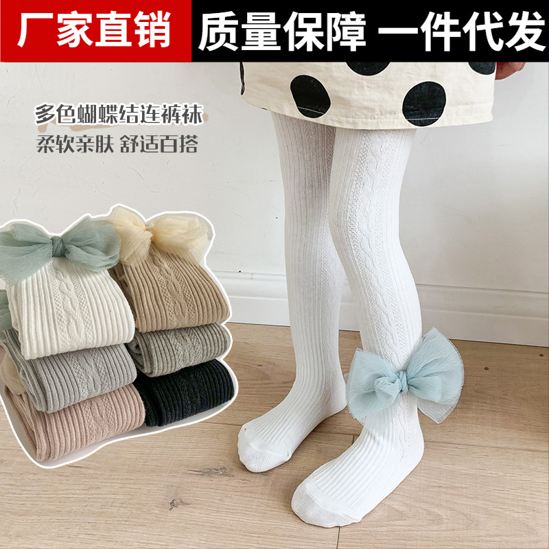 新しい子供のタイツと春と秋の薄い女の子の麻の花柄の蝶結びのタイツの白い赤ちゃんのタイツの靴下
