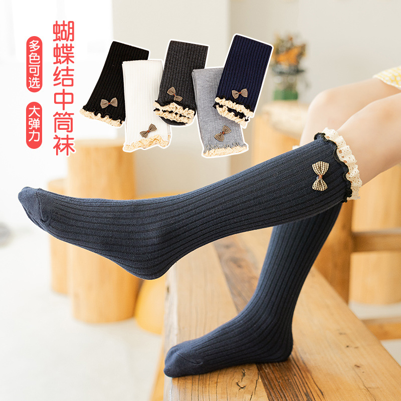 秋の薄い赤ちゃん春秋綿の女の子の純色のフックの花のレースの現物の黒い女の子の長い足の靴下の中で靴下の子供
