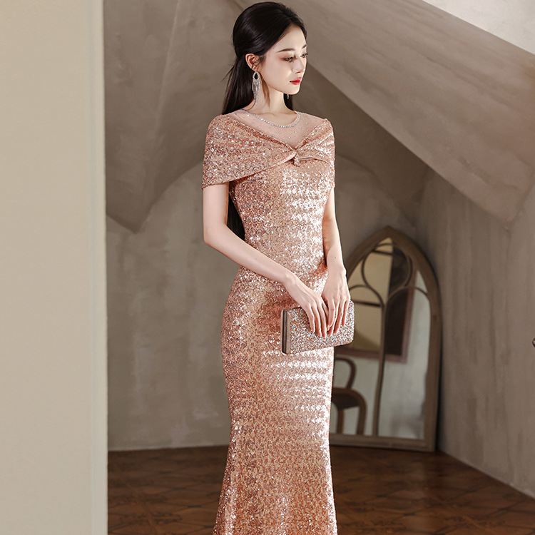 新しい女性のスパンコールドレス女性の夏の社交界の気質フィッシュテールロングスカートライト高級ハイエンドイブニングドレス供給