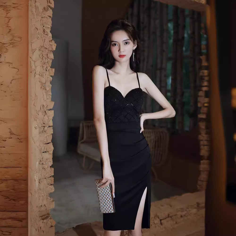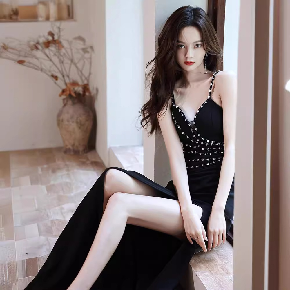 黒サスペンダーイブニングドレスロングスカート結婚式デート妖精スカート気質夏のイベントホストドレスセクシー