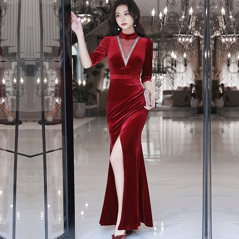誕生日パーティー晩餐会セクシーなサスペンダースカート女性用赤いセレブ風スリット入りスカート着痩せ効果のあるベルベットのエレガントなロングドレスイブニングドレス