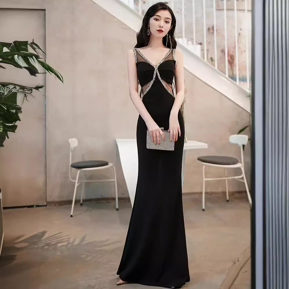 ロングサスペンダーイブニングドレス、ハイエンドの新しいライトラグジュアリーフィッシュテールスカート、スリムドレス、セクシーホストロングドレス、エレガント