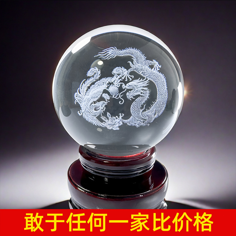 3d内彫透明水晶玉二龍戯珠置物八卦財神観音供養客間玄関誕生日プレゼント