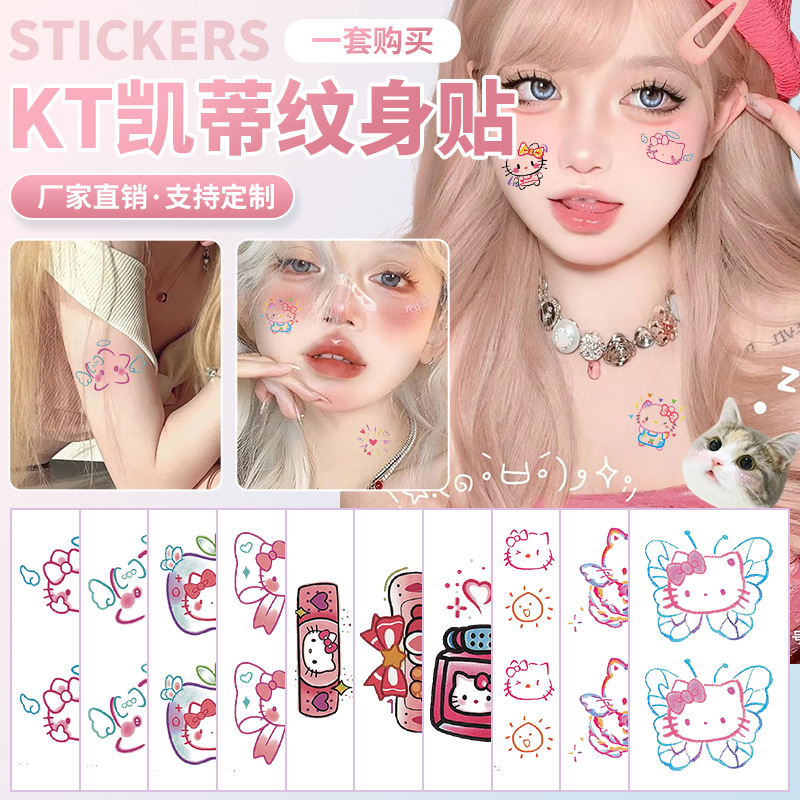 日本の漫画風KT猫のタトゥーステッカー、カラフルな線、キュートでインスタ映え、甘くてクールな女の子向け、長持ちするステッカー