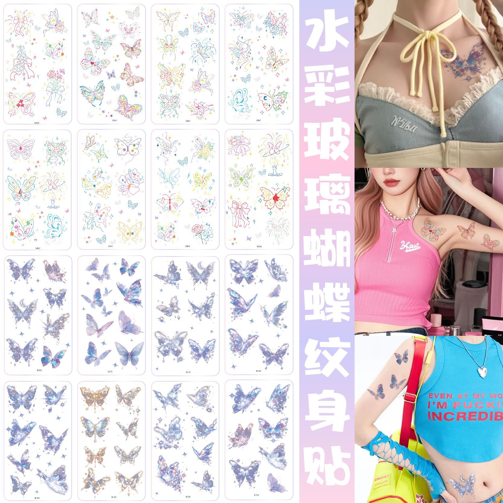 水彩風ガラス風シリーズ蝶カラータトゥーステッカー女性用防水シミュレーションホットガール甘くてクールなハイエンド同じスタイルステッカー