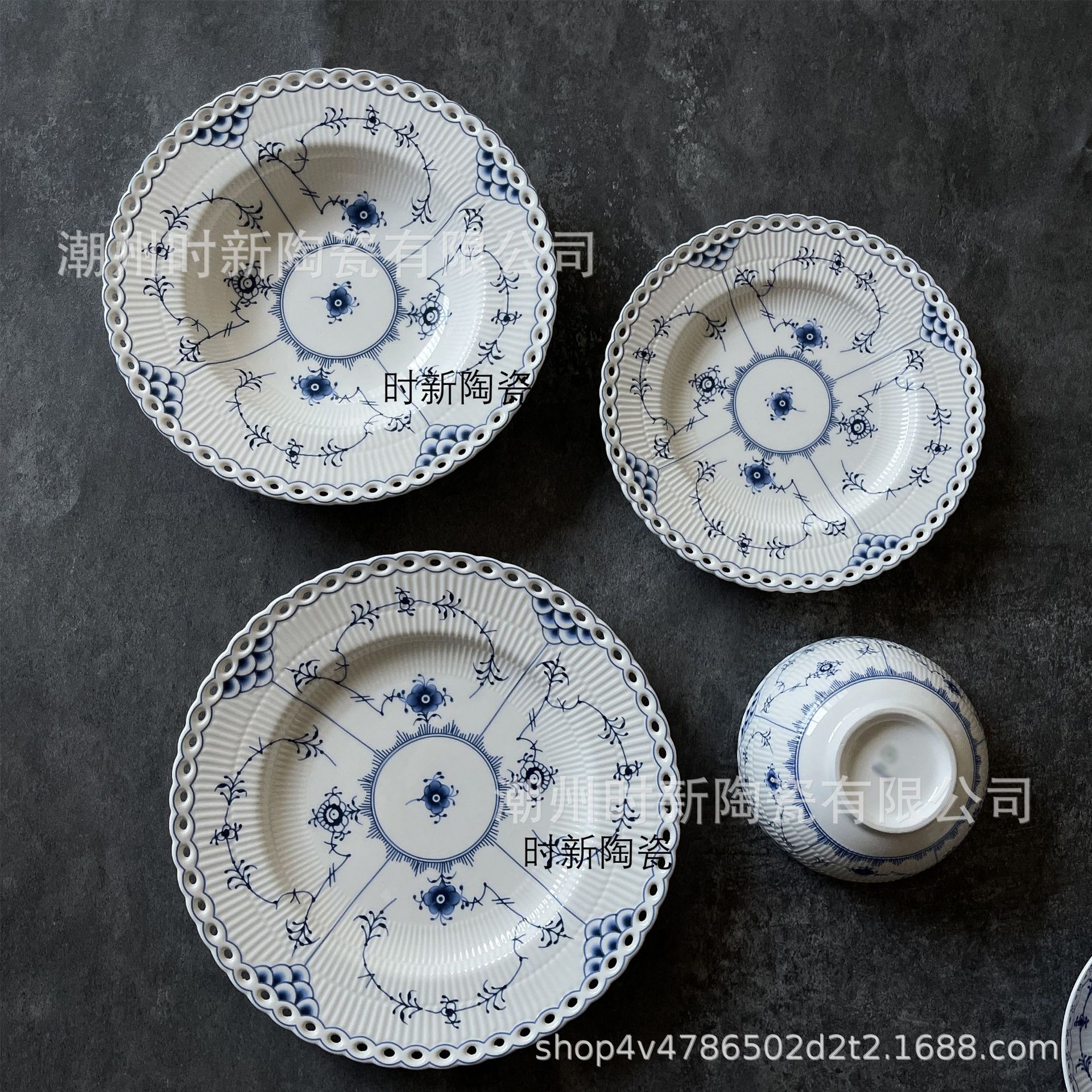 卸売唐草模様純白レリーフラウンドエッジフラットプレートフレンチパーム模様白レース中空洋食プレート家庭用食器